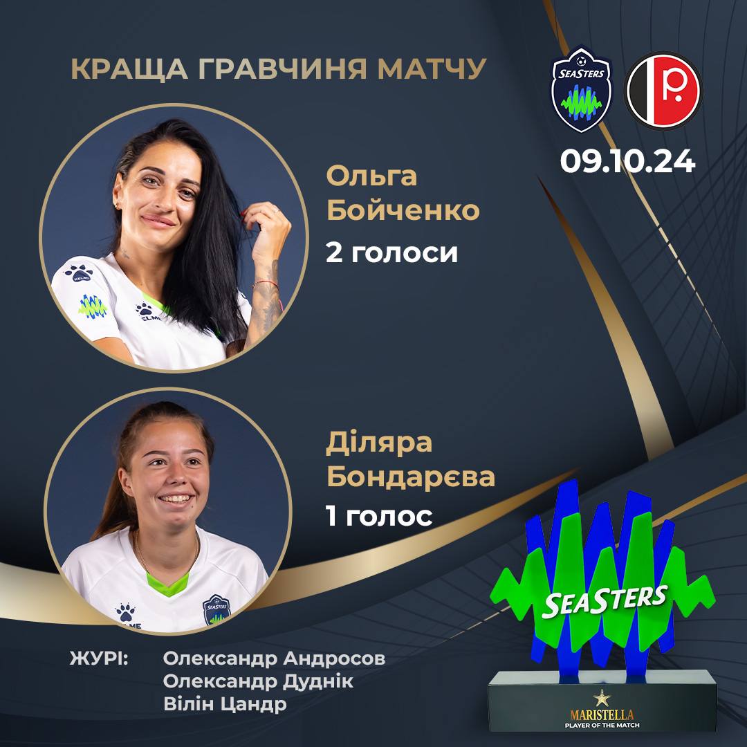 Два голоси було віддано капітану команди Ользі Бойченко @boichenkoolya (напевно, по одному за кожний забитий мʼяч), а один - Ділярі Бондарєвій @diliara_bondareva (напевно, за кожну гольову передачу🙃).